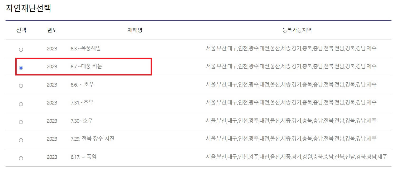 ☞ 자연재난선택에서 해당되는 재해명을 선택