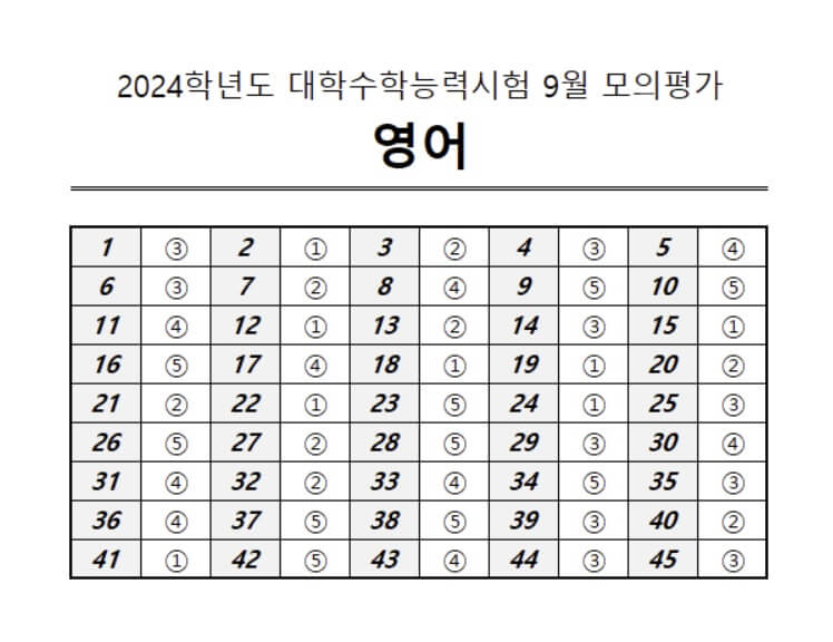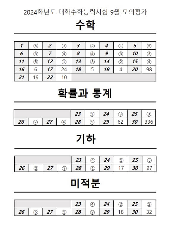 학교 교육을 통해 학습된 고등학교 교육과정의 내용과 수준에 맞춰 출제하고자 노력한 2023 9월 모의고사 점수 잘 확인하셨나요? 학교에서도 이미 진행됐을 테지만, 다시 채점하고 모의고사 점수 재확인하고자 하는 수험생 분들을 위해 준비했습니다. 채점 후 의문이 생겨 정답에 대한 이의신청을 하고자 하는 경우, 9월 9(토) 18시까지 한국교육과정평가원 홈페이지(https://www.suneung.re.kr/) 내 전용게시판을 이용하여 하시기 바랍니다. (정답 이의 신청과 관련이 없는 질문 및 의견 개진 등은 '열린 마당'을 이용바람)