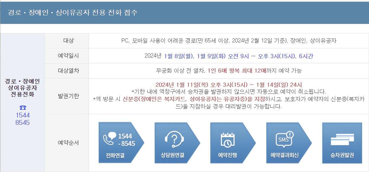 ✔ 장애인·상이유공자는 명절 예매 전용 홈페이지에서 반드시 사전 등록하여야 하며(경로는 가입 시 회원정보로 자동등록), 여행정보를 미리 저장하고, 예매 당일 불러오는 기능을 이용할 수 있습니다.