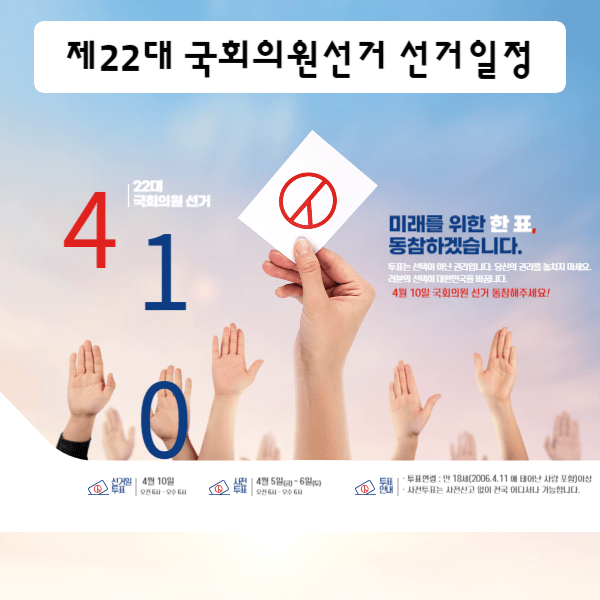 제22대 국회의원선거는 4월 10일 수요일에 진행됩니다. 하지만, 당일에 투표가 어려운 분들을 위해 사전투표도 진행되는데요. 사전투표 일정 알려드립니다.