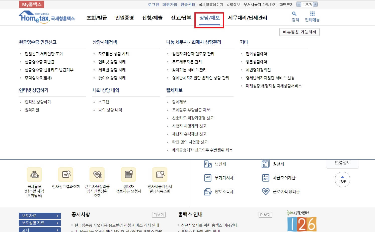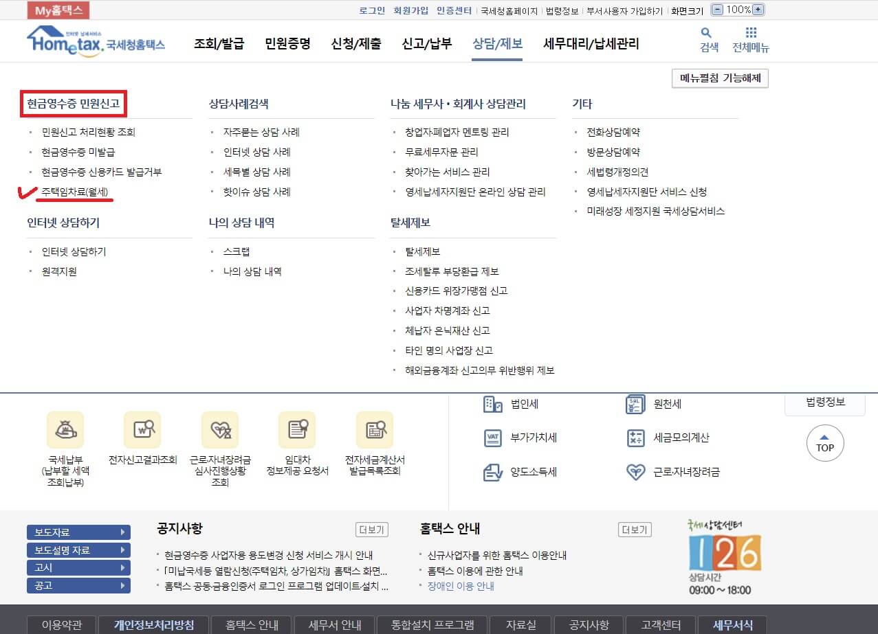▶상단 메뉴에서 [상담/제보] - [현금영수증 민원신고] - [주택임차료(월세)] 선택