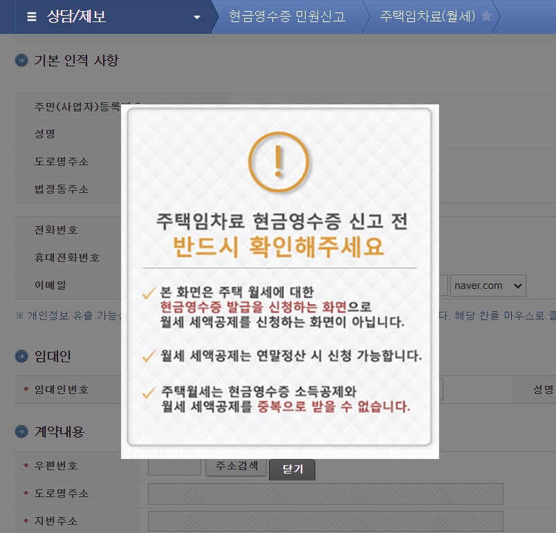 ※주의 : '주택임차료 현금영수증 발급 신청'은, 말 그대로 현금영수증 신청으로 연말정산 시 소득공제 되는 것입니다. "월세 세액공제"와는 다르며 중복으로 받을 수 없습니다.